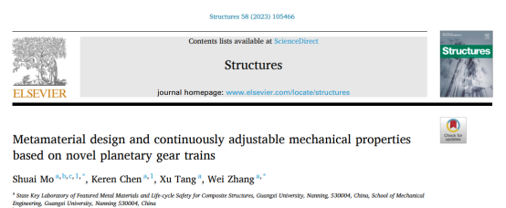 近日,莫帅教授团队在连续可变刚度行星轮系振动控制力学超材料/超结构领域取得研究进展,研究成果“Metamaterial design and continuously adjustable mechanical properties based on novel planetary gear trains”发表在结构工程领域国际权威学术期刊《Structures》(英国结构工程师学会(The Institution of Structural Engineers)会刊)。成果中创新提出的2类行星齿轮力学超材料新构型及对应振动调控超结构经《Structures》期刊评审专家和主编审议,被成功命名为“kaiyun官方网站登录入口齿轮力学超材料”(GXU-gear-M-C-I、GXU-gear-M-C-Ⅱ)。该成果以kaiyun官方网站登录入口省部共建特色金属材料与组合结构全寿命安全国家重点实验室为第一单位及通讯单位,莫帅教授为第一作者兼通讯作者,国家级人才张伟教授为共同通讯作者。